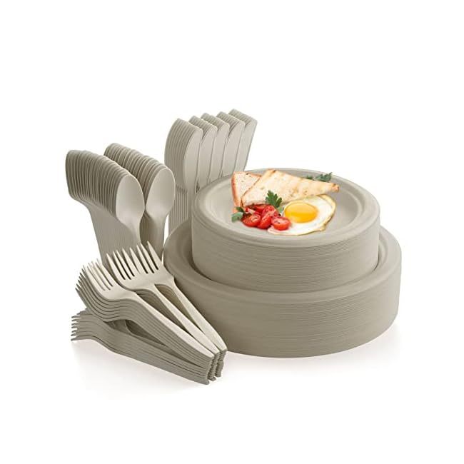 Fuyit 250Pcs Disposable Paper Plates Set with Cutlery, Compostable Biodegradable Eco-Friendly Dinnerware & Utensil Include Plate, Larger Fork, Knife & Spoon for Party, Camping, Picnic, BBQ (Natural)