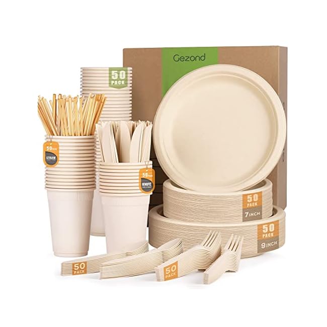Gezond 350pcs Compostable Paper Plates Set Eco-friendly Heavy-duty Disposable Cutlery Includes Biodegradable Forks, Knives, Spoons, Cups and Straws for Wedding Party, 50 Guests
