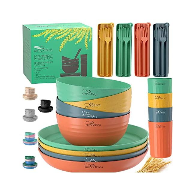DINETHICS Wheat Straw Dinnerware Sets For 4 (36pc) Unbreakable n Microwave Safe – Plates and Bowls Camping Cups Set RV Dishes for