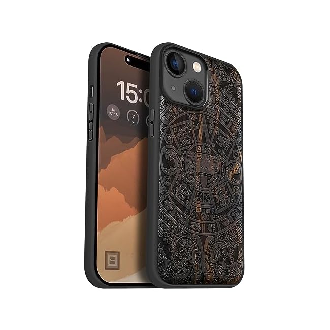 Carveit Magnetic Wood Case for iPhone 15 Case [Solid Wood & Black Soft TPU] Shockproof Protective Cover Unique Wooden Case Compatible with magsafe (Maya Calendar -Blackwood)