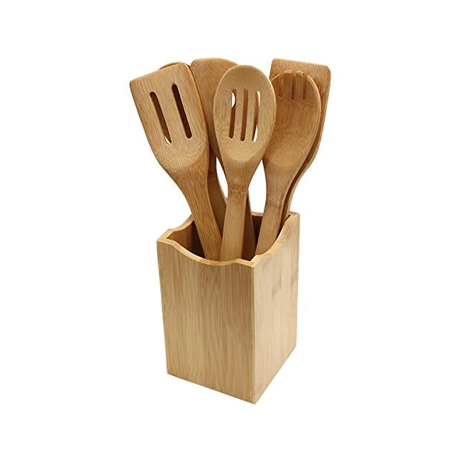 Oliva Italiana 7 Pc. Bamboo Kitchen Utensil Set w Holder, Eco-Friendly, 100% Organic bamboo, Wooden utensils, with ergonomic handle. Spoons for Cooking, Spatula, Ladle, Turner & Pasta Server