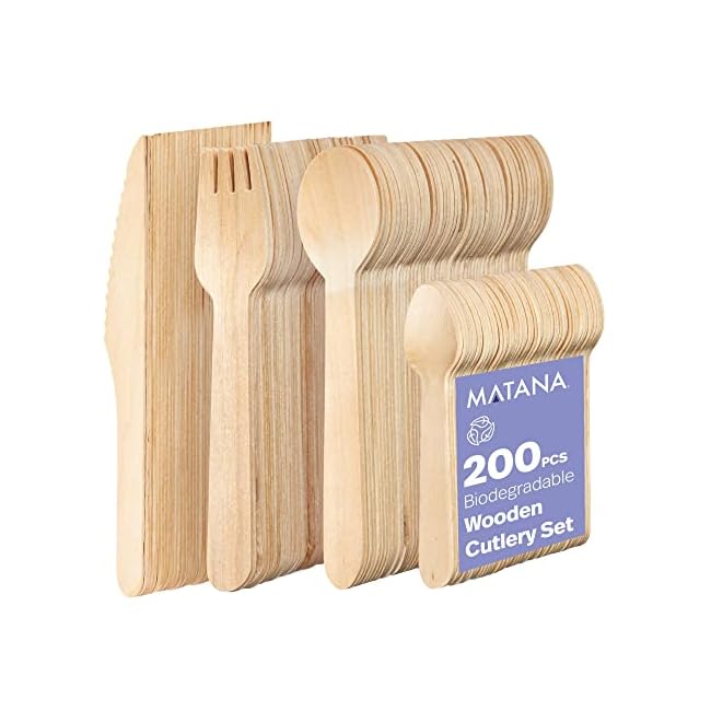 MATANA 100% Natural Disposable Wooden Cutlery Set – 200 Pcs (50 Forks, 50 Knives, 50 Spoons, 50 Tea Spoons), Recyclable Compostable Silverware, Biodegradable Bamboo Utensils for Garden Parties