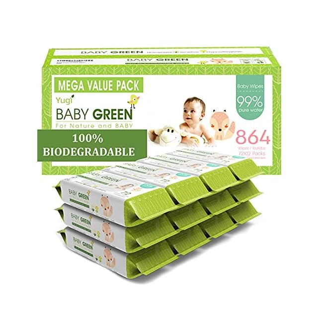 Yugi Baby Green Wipes Unscented Compostable Biodegradable and Organic– Value Pack (12 Packs of 72) 864 for Sensitive Skin & Nose