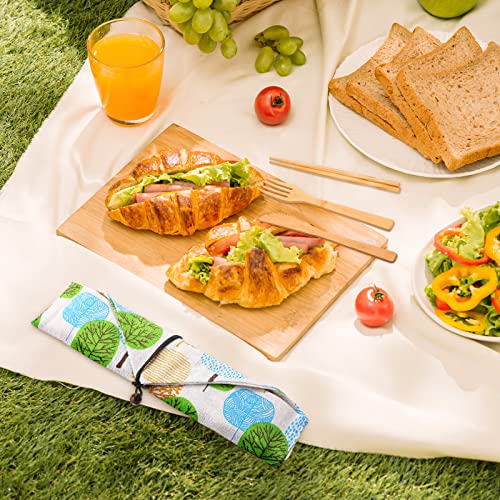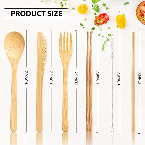 Package includes: 4 pieces camping utensils sets are wrapped in 4 different cloth bags, each bamboo tableware set contains 1 fork, 1 knife, 1 spoon, 1 pair of chopsticks, 1 straw, 1 brush with 1 cloth storage bag