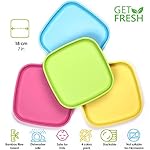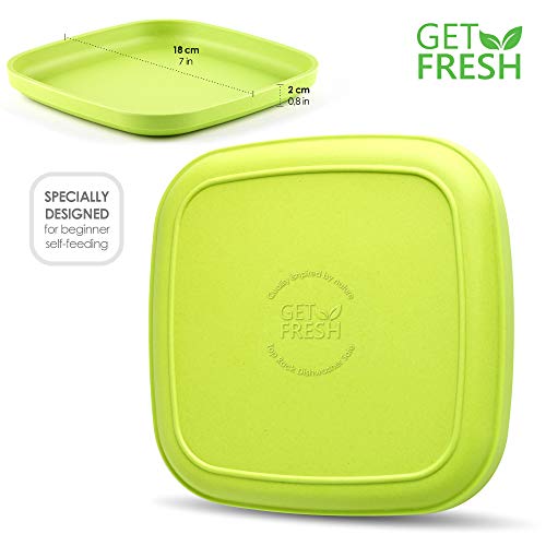 ✮ BAMBOO FIBER KIDS DINNERWARE ✮ – Being bamboo fibre based with no toxic ingredients our bamboo kids plates are safe for kids. It does not affect aroma, consistency or food taste. ✮ SAFE FOR KIDS ✮ – Bamboo kids dinnerware is sustainable and great for picnics, outdoor parties & at home. Have no sharp edges and are crack resistant. Suitable for all ages. ✮ GREAT FOR BEGINNER SELF-FEEDING ✮ – GET FRESH bamboo plates are specifically designed for kids starting taking meal on their own. Being very easy to handle with small hands our kids set promotes quick obtaining self-feeding. ✮ 4-PACK SET ✮ – Bamboo fibre plates are perfectly sized for kids of 4 different colours – green, blue, pink and yellow. Easily stackable for saving kitchen space. ✮ EASY TO CLEAN ✮ – Our bamboo dinnerware is dishwasher safe and very easy to clean. After each use just put it in the dishwasher (top rack) for quick cleaning. Not suitable for microwave.