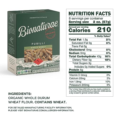 ORGANIC WHOLE WHEAT – This pasta is made with organic durum wheat grown exclusively in Italy. Enjoy nutritious whole wheat pasta without sacrificing taste and texture NATURAL INGREDIENTS – Bionaturae’s Whole Wheat Fusilli is made from the highest quality durum wheat semolina and uses only the finest ingredients QUICK AND EASY TO COOK – Our Whole Wheat Fusilli Pasta cooks quickly to provide you with a delicious al dente noodle that can be served with any sauce MADE THE TRADITIONAL ITALIAN WAY – Dried slowly at low temperatures to preserve a superior flavor & pressed through bronze dies for course & firm texture OUR STORY – Bionaturae is embraced by American consumers as the premier brand of organic foods from Italy. We have remained a family-oriented with a heartfelt devotion to quality and tradition| Brand | Visit the bionaturae Store |