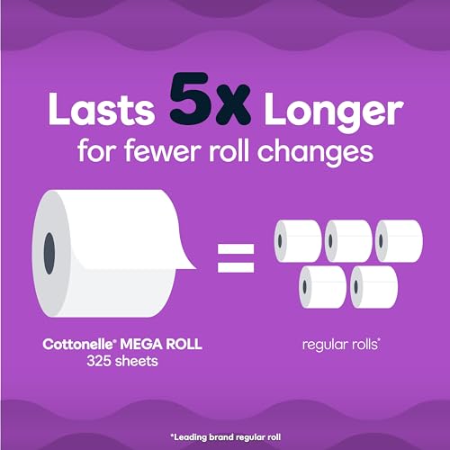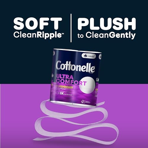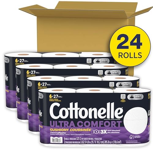 24 FAMILY MEGA ROLLS: Cottonelle Ultra Comfort Toilet Paper with Cushiony CleaningRipples Texture, 2-Ply, 24 Family Mega Rolls (4 packs of 6); 325 sheets per roll. GENTLE SUSTAINABLE TOILET PAPER: Cottonelle Ultra Comfort toilet tissue leaves you comfortably dry with premium softness that cleans gently, removes moisture and is safe for sensitive skin. ABSORBENT TOILET TISSUE: Super soft, quality 2-ply toilet paper is septic-safe and 3x more absorbent** to keep your hands and bottom protected and clean as you wipe. TOILET TISSUE FOR A HEALTHY CLEAN: Use Cottonelle toilet paper and Cottonelle flushable wet wipes together for a refreshing, shower fresh clean. FSC-CERTIFIED TOILET TISSUE: Cottonelle is FSC certified ensuring we source from responsibility managed forests to prevent deforestation and only uses fibers that are 100% plant-based and free of harsh chemicals.| Brand | Visit the Cottonelle Store |