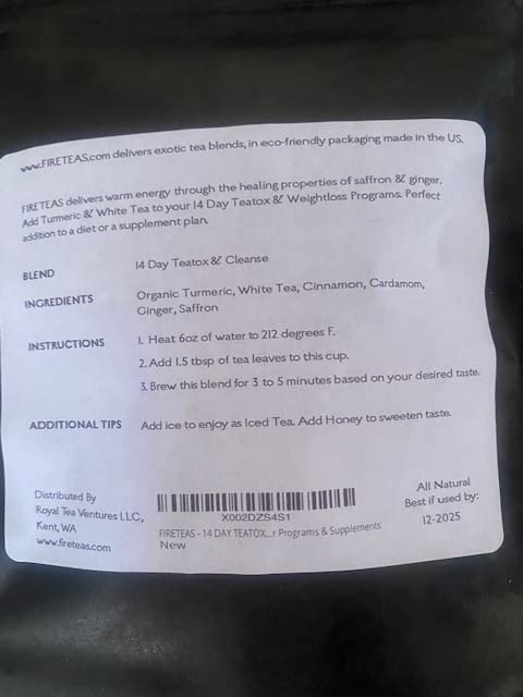 Teatox your body & awaken its inner GLOW with the magic of White Tea & Turmeric. Each Detox & Glow pouch comes with 10 Biodegradable Pyramid Teabags which can be brewed up to 3 times per tea bag (30 cups total). The bags are are made of the highest quality materials that float beautifully when you drop it in your tea cup, & are potent enough to be reused immediately. High energy levels can be a result of this drink. Helps in Fitness Goals. The antioxidant & catechin levels in White Tea, Turmeric, Cinnamon, Saffron, Ginger & Cardamom, are high in quantity. Therefore they help & increase metabolism, playing an important role for anyone who has started a Fitness program & is looking to include a healthy supplemental drink. Did we say its also delicious? Luxury Bai Mudan Tea. Minimally processed with the highest antioxidant levels (EGCG), White Tea is easily one of the rarest, healthiest & most expensive luxuries in the tea world. It helps in skin rejuvenation & has anti aging properties. In ancient China, White Tea was a luxury only reserved for the royalty. Now you have it too! Turmeric Tea is the latest trend for health lovers. Curcumin, the active ingredient in Turmeric, has immune system boosting properties protecting you from free radicals, and is also great for treating digestive system disorders. Also packed with anti oxidants, turmeric has great skin cleansing effects & has been used for centuries for having a glowing skin in India. It adds a great flavor & color to anything it touches. All Natural, Compact & Eco Friendly Product Made in the USA. Our tea is packaged in biodegradable pyramid teabags & the pouch is made of rice paper which is also really compact & easy to store. Easy to recycle & dispose of without hurting the environment. Everything is manufactured & packaged in the USA| Brand | Visit the FIRE TEAS Store |