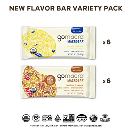 FIND YOUR NEW FAVORITE NUTRITION BAR: Get your hands on the 2 newest additions to the GoMacro lineup – Lemon + Lemon and Double Chocolate + Peanut Butter Chips. Each 12ct Variety Pack contains 6 of each flavor. HEALTHY INDULGENCE: Stay energized, satisfied, and fueled with recognizable ingredients and plant-based protein. Whether you enjoy them as a meal replacement, snack bar on-the-go, or delicious treat, eating clean never tasted so good! CERTIFICATIONS YOU CAN TRUST: All GoMacro protein bars are Certified Organic, Vegan, Gluten-Free, Kosher, Non-GMO, C.L.E.A.N., and Soy-Free so you can snack with confidence. If there were a certification for delicious, we’d have that too! RESPONSIBLY SOURCED: We believe that natural food that is closer to the earth and less processed is healthier for the body and soul. We only work with suppliers who meet our high standards for taste, certifications, and environmental stewardship. HIGH PROTEIN SNACKS ON A MISSION: Mother-daughter owned, sustainably driven, and based in a rural community, our mission is to spread awareness for a balanced, plant-based lifestyle with vegan bars that have positive effects on the world.| Brand | Visit the GoMacro Store |