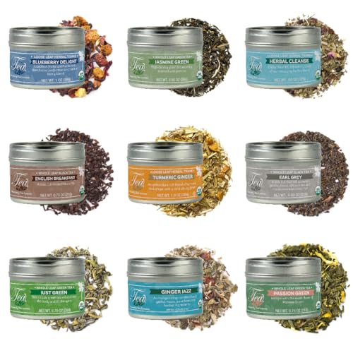 Organic Loose Leaf Tea Sampler: A collection of 9 premium quality loose tea leaves featuring a mix of caffeinated teas and naturally caffeine-free herbal tisanes