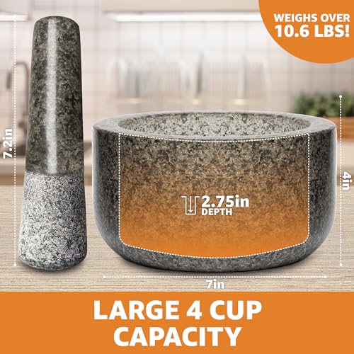 GRIND, BLEND and MASH THE FRESHEST FLAVORS: This mortar and pestle set large size with an extra large 4 cup capacity and sturdy 6.5 inch pestle gets the job dine quickly. Crush, grind and pound herbs, nuts, spices and more to release natural flavors and aromas easily with minimum fuss.