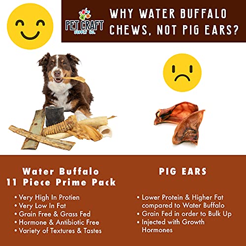 ALL NATURAL : 100% all-natural, free-range, grass-fed with no chemicals or additives, just safe Water Buffalo. This value pack contains 11 protein packed items. Pure Water Buffalo Ear, Horn, Tails, Cheek Strips, Trachea , Rib Bones and a Femur Bone! Your dog of any age will love the variety of tastes and textures from the Prime Cut Pack. LONG LASTING : Similar to Cow Ears, Pigs Ears, or Antler Dog Chews, even compared to Bully Sticks, Water Buffalo is very durable and long lasting. Keep your dog happy for hours with this variety pack of tough chews. These are safe and easily digestible. The natural texture helps promote healthy teeth and gums SAFE Alternative to Pig ears chews. Keep your dog focused on positive chewing, have your pet chew the water buffalo horn, or tail, not your favorite chair or pair of shoes. This pack of dog chew and treats are great for small dogs and big dogs alike. RECOMMENDED for Puppies to Adult dogs. Safe for all dogs. If Sharp edges occur, please take away from your dog. Also, ensure that the chew is larger than your dogs mouth, and always supervise your pet when playing. PROTEIN packed and low in fat. This single sourced protein is an amazing treat for your dog, and a perfect alternative if your dog has sensitivities to pork, chicken or beef. Water Buffalo has less fat when compared to the same part in Beef or Pork. Consider other Pet Craft Supply treats and chews for added variety for your pet. High in protein, and low in fat. Gluten & Grain Free from antibiotics and added hormones. Slow roasted for natural flavor. USDA Certified & Inspected. PET CRAFT PROMISE: If your pet isn’t totally happy with the product, please contact our team of caring pet lovers to help you. Just visit our website for more information.| Brand | Visit the Pet Craft Supply Store |