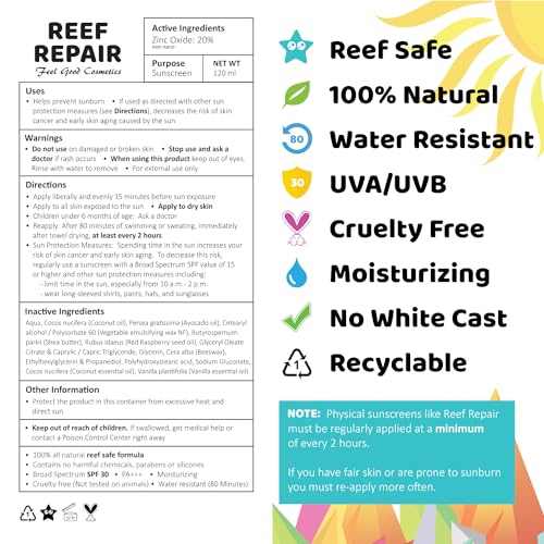 Revolutionary Sun Cream :: Moisturizing SPF 30+ reef safe sunscreen, waterproof for up to 80 minutes whether in the sand, sun, sea or surf. Strong broad spectrum protection from both UVA / UVB rays to protect against from sun burn and DNA damage. PA+++ Coral Reef Safety :: Reef Repair suncream is a (non nano) Zinc Oxide based reef safe sunscreen that is 100% Oxybenzone free, Octinoxate free & completely chemical free. Safe for marine and aquatic life including our delicate coral reefs, guaranteed to protect! Ingredient Safety :: Reef Repair sunscreens are 100% Paraben free, Silicone free & Titanium Dioxide free, providing proven sun & skin safety for you and your family. Our A+ grade Zinc Oxide mineral sunblock gives you the strongest UV protection available. Daily application is now fun and easy. Ultra Clear :: Non Sticky, non oily water based & biodegradable mineral sunscreen. Applies transparently with almost no rubbing and spreads evenly on your skin. No white cast or ghosting effect like other natural physical sunblocks. Does not leave sticky or greasy feeling on your skin and will not cause excessive sweating. Other Benefits :: Our 100% natural biodegradable sunscreen is a revolutionary layer of sun protection, moisturisation and repair for new, sensitive or damaged skin. All natural and safe formula, with bonus ingredients like red raspberry seed oil and coconut oil for extra sun care and protection.| Brand | Visit the REEF REPAIR Store |