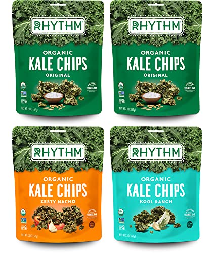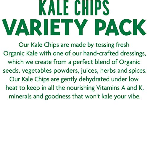 PERFECT ON-THE-GO SNACK: Don’t let your busy day stop you from living a healthy, nutrient-rich lifestyle. Enjoy 4 convenient, snack size kale chip packs to fuel your day! Our variety pack includes: 2 Original, 1 Zesty Nacho, and 1 Kool Ranch. FIND YOUR RHYTHM: Various unique flavors – Our dehydrated kale chips are always dried, never fried made by tossing fresh, organic kale with one of our hand-crafted dressings, which we create from a perfect blend of organic seeds, vegetable powders, juices, herbs and spices. WHAT MAKES US SUPER: Some folks throw the term ‘superfood’ around as a buzzword, but to us, it’s much more. It’s our name. It defines who we are, and what we offer — and it all begins with the nutrient density and integrity of our ingredients. They’re what make us super. BALANCE & HARMONY: A positive mind, eating right, and staying active can make all the difference. From vegetarian to gluten-free to non-GMO, our snacks help you find that healthy groove. SIMPLE INGREDIENTS: Nutrient-dense superfoods: vegan, protein fueled, and an excellent source of fiber. There’s nothing more to it.