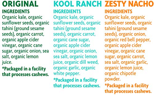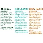 PERFECT ON-THE-GO SNACK: Don’t let your busy day stop you from living a healthy, nutrient-rich lifestyle. Enjoy 4 convenient, snack size kale chip packs to fuel your day! Our variety pack includes: 2 Original, 1 Zesty Nacho, and 1 Kool Ranch.
