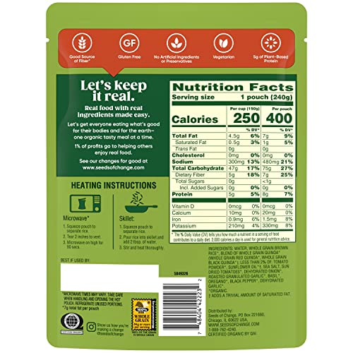 Twelve 8.5 OZ pouches of SEEDS OF CHANGE Certified Organic Quinoa & Brown Rice with Sun Dried Tomato Easy-to-prepare rice works as an integral part of your favorite side dishes and rice bowls for any occasion Delectable organic food features whole long grain brown rice, quinoa super grains and sun dried tomato for flavorful goodness Instant rice is ready to eat in 90 seconds; prepare in a microwave or skillet to save precious time whenever you’re hungry for a tasty rice bowl Enjoy your quinoa and brown rice blend as part of your favorite buddha bowl recipes or as an instant rice side dish| Brand | Visit the SEEDS OF CHANGE Store |