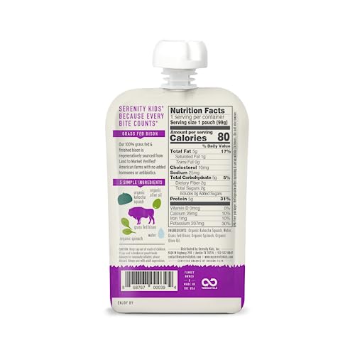 100% GRASS FED BISON: Contains 12 pouches of baby food purees made from ethically sourced Grass Fed Bison with Organic Kabocha Squash and Spinach.