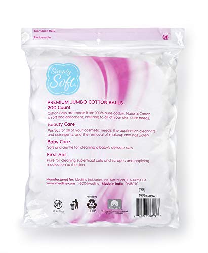 Simply Soft Cotton Balls are made with 100% pure, natural cotton Clean & pure cotton white with smooth texture Extra soft & absorbent for all kinds of skincare, first aid & baby care Ideal for applying cosmetics and medications like creams, lotions, oils or astringents. Also great for removing makeup or nail polish Gentle on skin, yet strong and durable | 3 – 200 Count bags for a total of 600 cotton balls| Brand | Visit the Medline Store |
