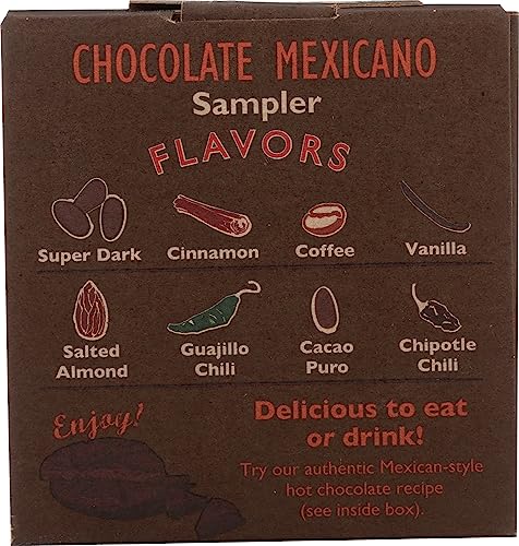Contains 8 – 1.35oz Mexicano Discs ( Cacao Puro, Chipotle Chili, Cinnamon, Coffee, Guajillo Chili, 85% Super Dark, Salted Almond, and Vanilla)