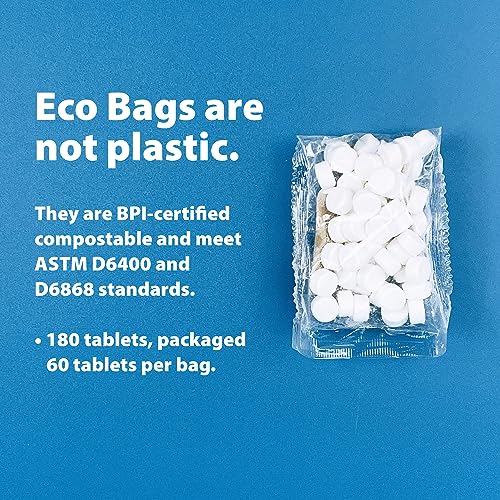 Eco bags are not plastic. They are BPI-certified compostable and meet ASTM D6400 and D6868 standards. 180 tablets, packaged 60 tablets per bag.