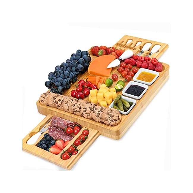 Cheese Board and Knife Set, Bamboo Charcuterie Boards Large Extra Meat Charcuttery Platter Serving Tray for Housewarming Thanksgiving Personalized Holiday Christmas Birthday Wedding Party Gifts Ideas