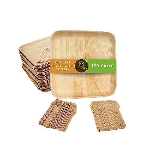 ECONLY party pack of 150 | Eco-friendly Palm Leaf Plates with Cutlery | 50 Disposable 8″ Square, 50 Wood Forks, 50 Knives Heavy Duty Biodegradable Utensils