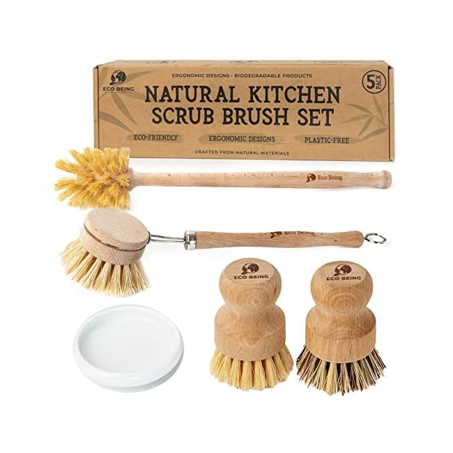 Eco Being Natural Bubble up Dish Brush Set with Soap Dispenser. Bamboo Dish Brush Set with Strong, Plastic Free Scrubber Brushes & Wooden Handles ~ 5 Piece Kitchen Set Makes Cleaning Dishes Easy.